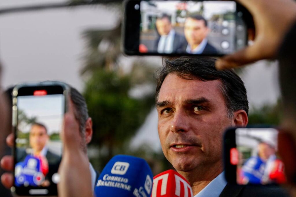 Brasília (DF), 11/09/2025 – O senador Flávio Bolsonaro, fala com jornalistas em frente do condomínio onde seu pai, ex presidente Jair Bolsonaro cumpri prisão domiciliar.