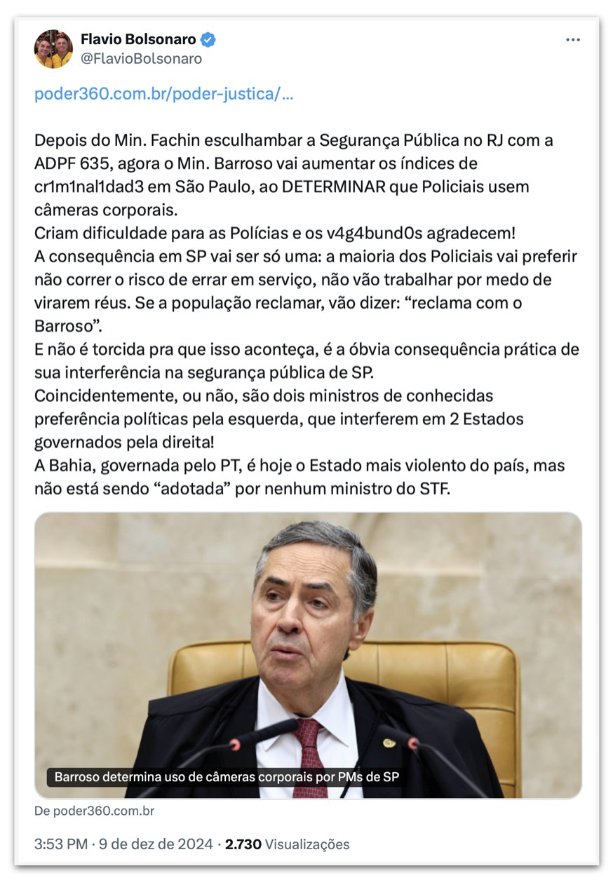 O senador Flávio Bolsonaro (PL-RJ) criticou a decisão do presidente do STF ministro Roberto Barroso, de determinar o uso obrigatório de câmeras corporais por policiais militares em São Paulo.