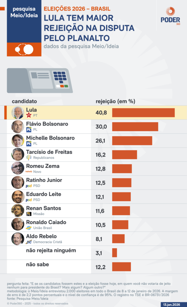 Pesquisa Meio/Ideia divulgada nesta 3ª feira mostra que o presidente Lula da Silva (PT) tem o maior percentual de rejeição na disputa ao Planalto entre os nomes testados pelo levantamento: