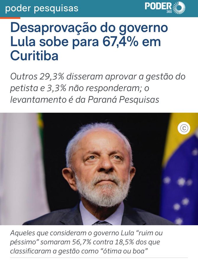 “Curitiba nunca decepciona. Maior taxa de desaprovação do Governo Lula entre as capitais (67,4%), segundo a Paraná Pesquisas. Lula não foi popular em Curitiba nem quando morou aqui”.