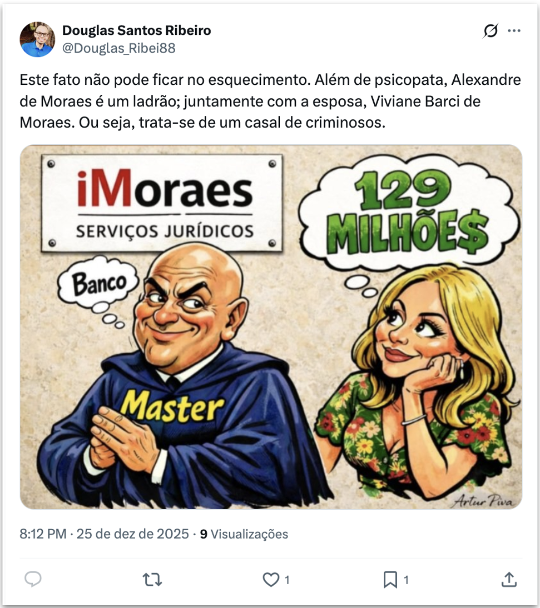 A relação entre o ministro do STF Alexandre de Moraes, sua mulher, a advogada Viviane Barci, e o Banco Master passou a circular em memes nas redes depois da divulgação de um contrato milionário e de encontros entre Moraes e o presidente do Banco Central, Gabriel Galípolo.
