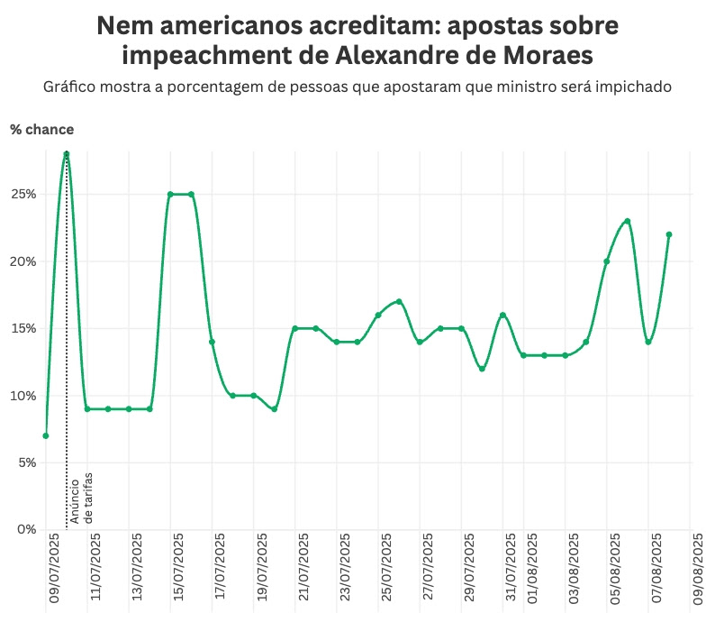 O pico de apostas favoráveis ao impeachment de Alexandre de Moraes aconteceu em 10 de julho de 2025, quando a tensão entre Brasil e Estados Unidos atingiu um novo patamar.